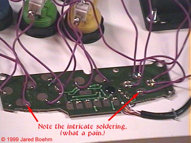 What you're looking at is a modified Super Nintendo Controller! It plugs into the connector I built for my parallel port and features 8 Happ Horizontal Microswitch buttons, (6 for the actual games, and 2 for start and coin,) and a Happ Super 8 joystick, (which I'm VERY pleased with I might add). The box and control panel are made from 3/4" shelving material that I found at Home Base for like $6. The cool thing is that I didn't have to cover it with anything! I'm in the process of building another one of these contraptions so that two people can play, or you could stick them side by side for 2-joystick games. The connector I built for the parallel port supports up to 5 SNES pads so maybe down the road I'll build a couple more for some serious Simpson's action!